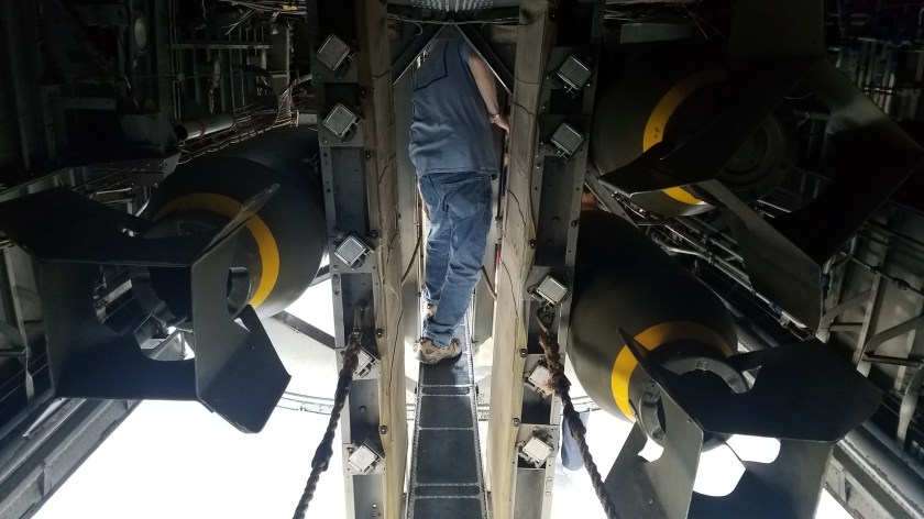 Jim squeezing through b-24 bomb bay